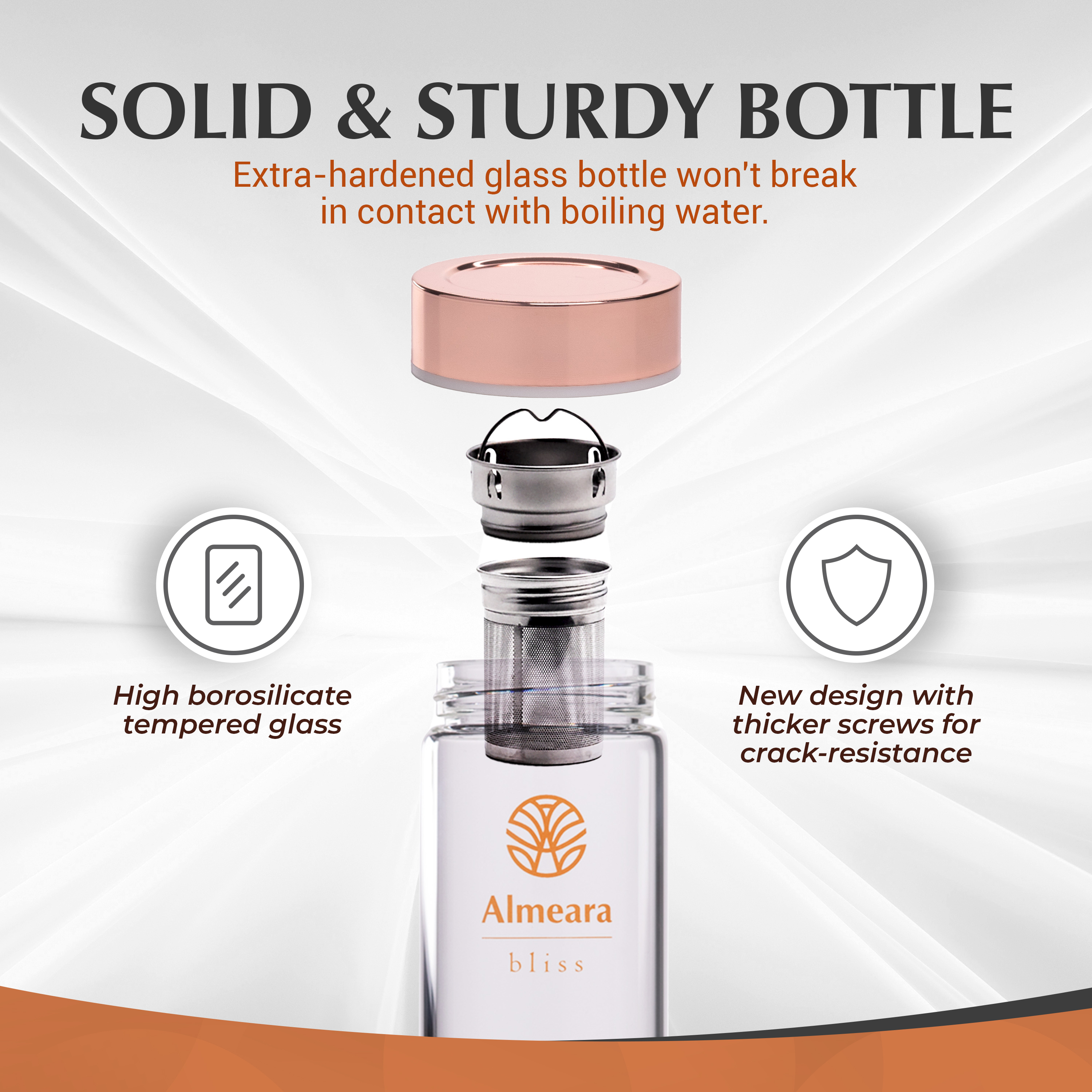 The Almeara Crystal Water Bottle is made with extra durable borosilicate tempered glass - with thicker screws for added crack-resistance. This ensures your glass bottle won't break easily, even if it comes in contact with boiling water. Perfect for hot tea or cold fruit juice, which you can strain using the stainless steel tea strainer included in the package.